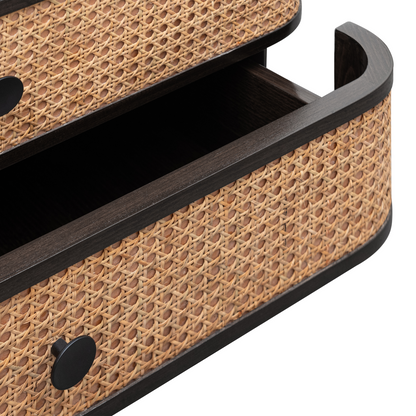 This bedside table blends timeless craftsmanship with modern elegance. Featuring a smooth wooden top and beautifully woven cane drawer fronts, it adds warmth and texture to any bedroom. The softly rounded edges and balanced proportions give it a refined, contemporary look, while the two spacious drawers provide practical storage for everyday essentials. Designed to complement modern, mid-century, and earthy interiors, this piece works perfectly as a bedside table or accent unit.