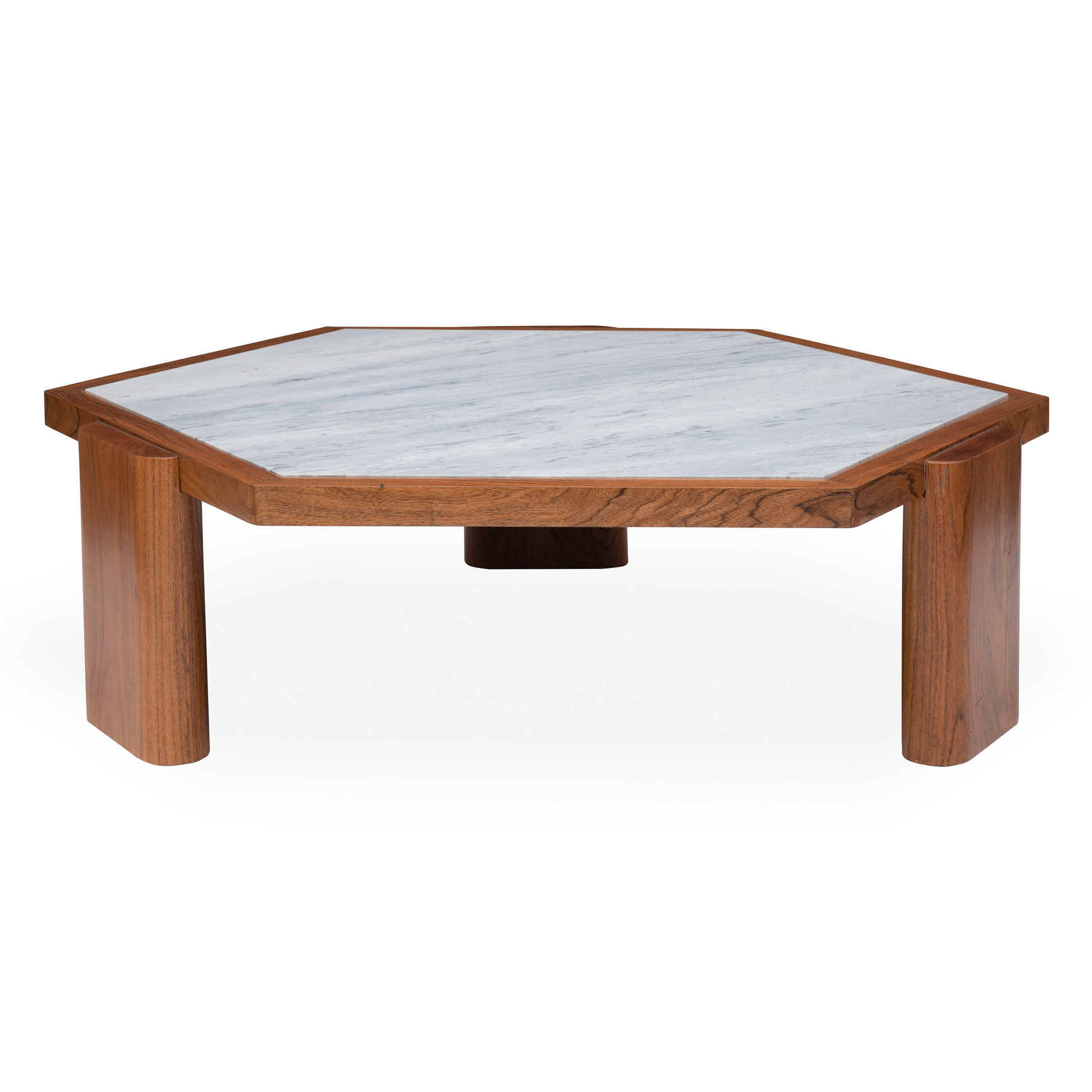 The Natural Wood Coffee Table features an elegant hexagonal design that harmonizes warm solid acacia wood with a luxurious marble top. Driven by our interpretation of the Arts and Crafts movement, this piece celebrates exceptional craftsmanship through its three distinctively sculpted legs and precise joinery.