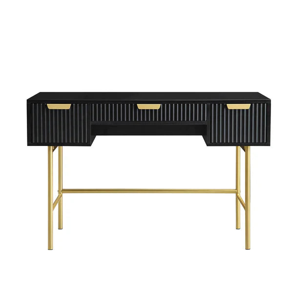 • The dressing table features 3 drawers with a front finished in matte paint, paired with gold handles and legs.