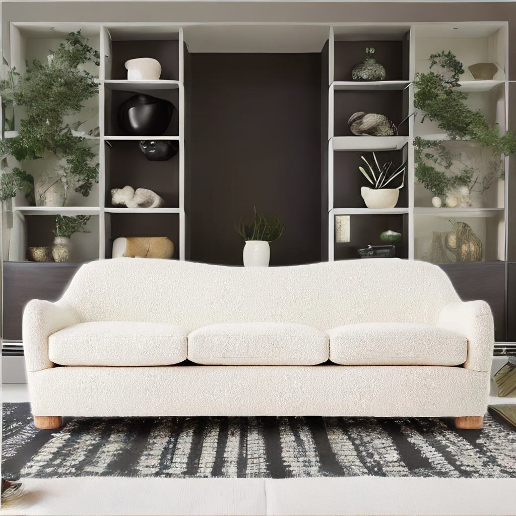 The sofa is upholstered in a soft and cozy fabric that is often referred to as "Teddy" fabric. Teddy fabric is a type of plush, textured material that resembles the softness of a teddy bear's fur, hence the name. This fabric not only adds a touch of luxury but also provides a warm and inviting feel to the sofa.