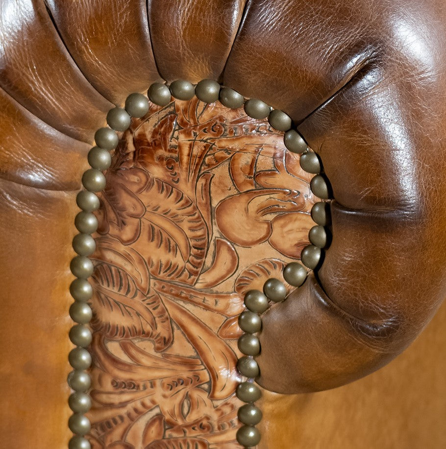 Leather Description: Artisan Leathers beautifully evoke this time worn quality, unique to every individual piece, like the originals. To pure aniline leather crusts, already fully and carefully upholstered to the piece, a base color is created with multiple applications of waxes and oils, hand-worked by the leather Artisan. After drying, this craftsman then carefully builds-up the finish with an expert’s eye, and touch, to achieve an aged patina in just the right places to reflect the aged qualities only time, wear, and frequent care could have accomplished naturally. Embossed Leather Description: A leather used to accent many of today's home interiors.
